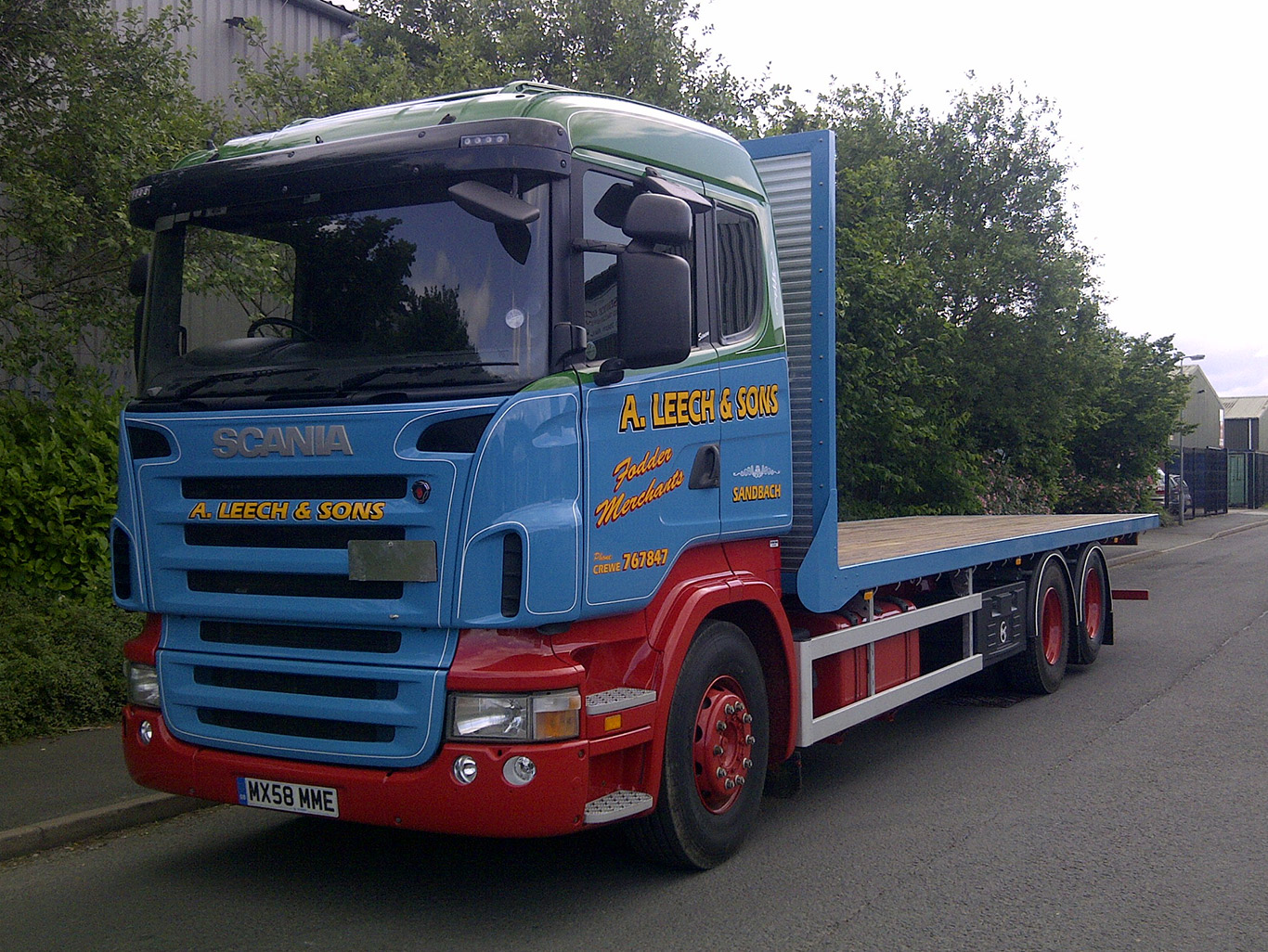 The picture shows the 2nd conversion done for A Leech and sons. We converted the vehicle from a 4×2 tractor unit to a 6×2 rigid with a new tag axle and draw bar coupling. We then built the 28’ flatbed body to be able to carry hay and straw. We also converted a tri axle draw trailer from a semi-trailer to go behind this Scania. They then asked if we could make the front axle of the trailer lift which we obliged by making brackets for it.